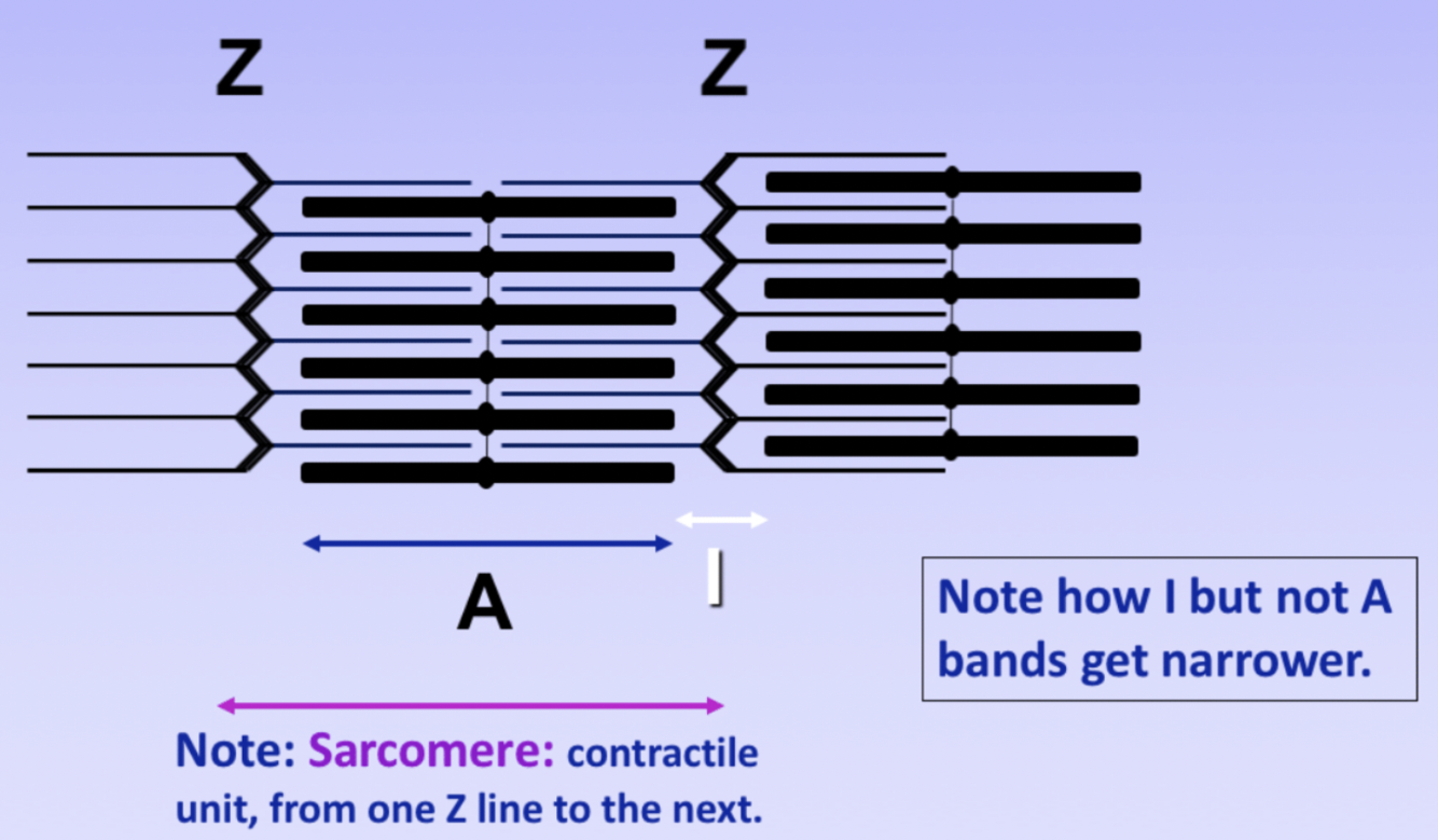 As contraction occurs, the I bands get smaller and the Z lines get closer to the A band. Overlap between thick and thin filaments increase, thin filaments slide over the thick filaments This is the sliding filament model of contraction