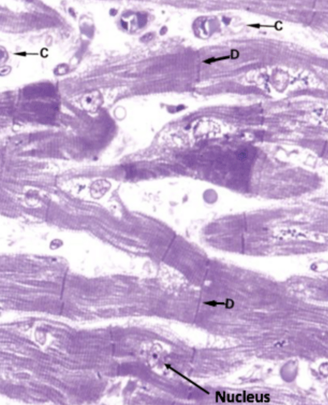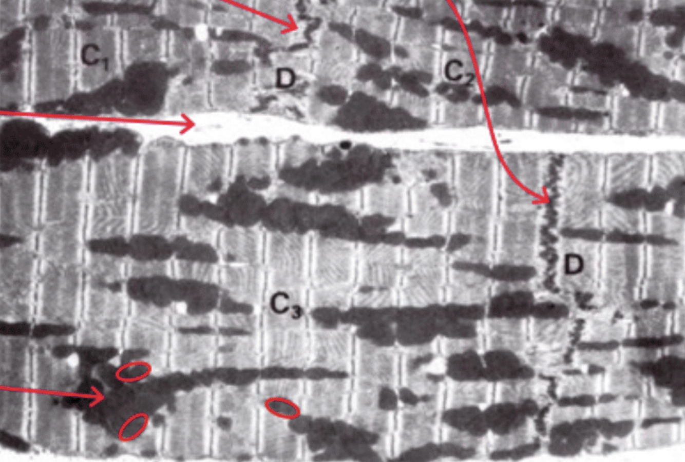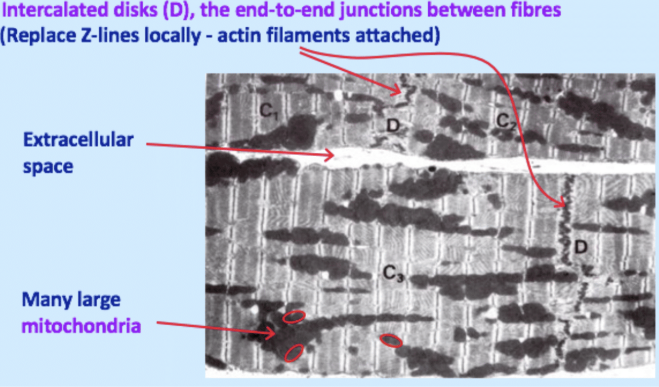 Intercalated disks (D) are end to end junctions entre fibers which separate the cells (eg C1, C2, C3). These replace Z lines locally and the actin filaments attach to this.