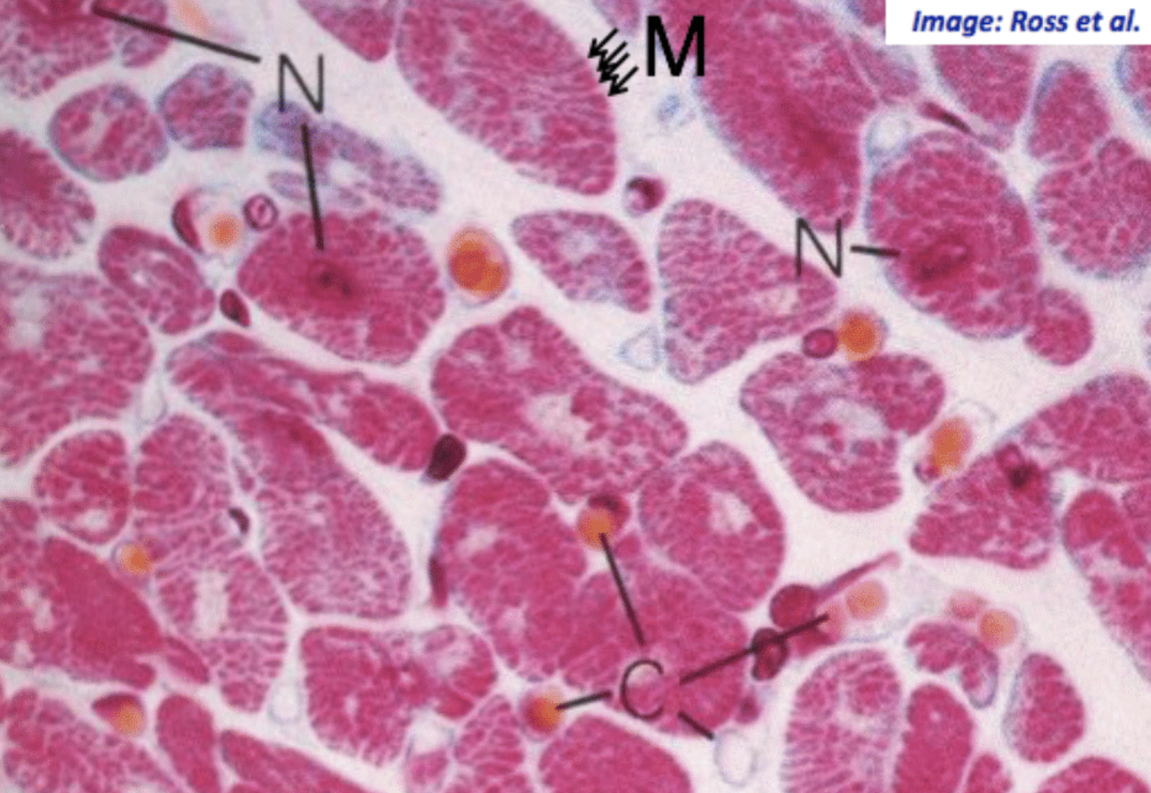 Hay partial divisions into myofibrils (M), and many capillaries (C)