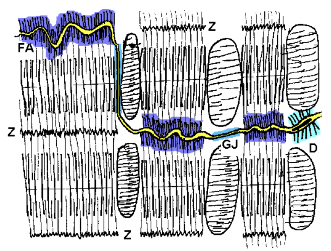 •fascia adherens (FA) are anchoring sites for actin, and connect to the closest sarcomere.