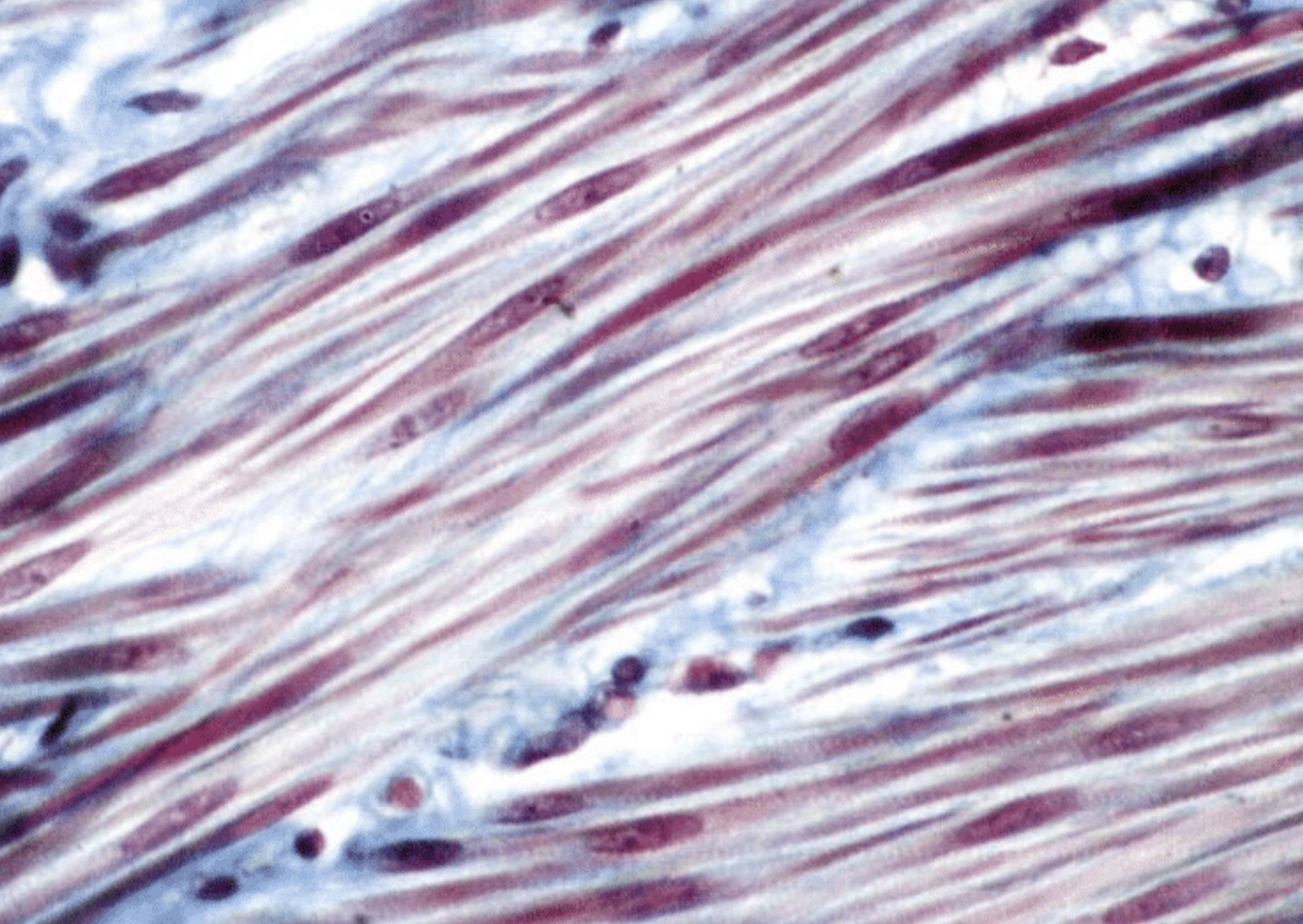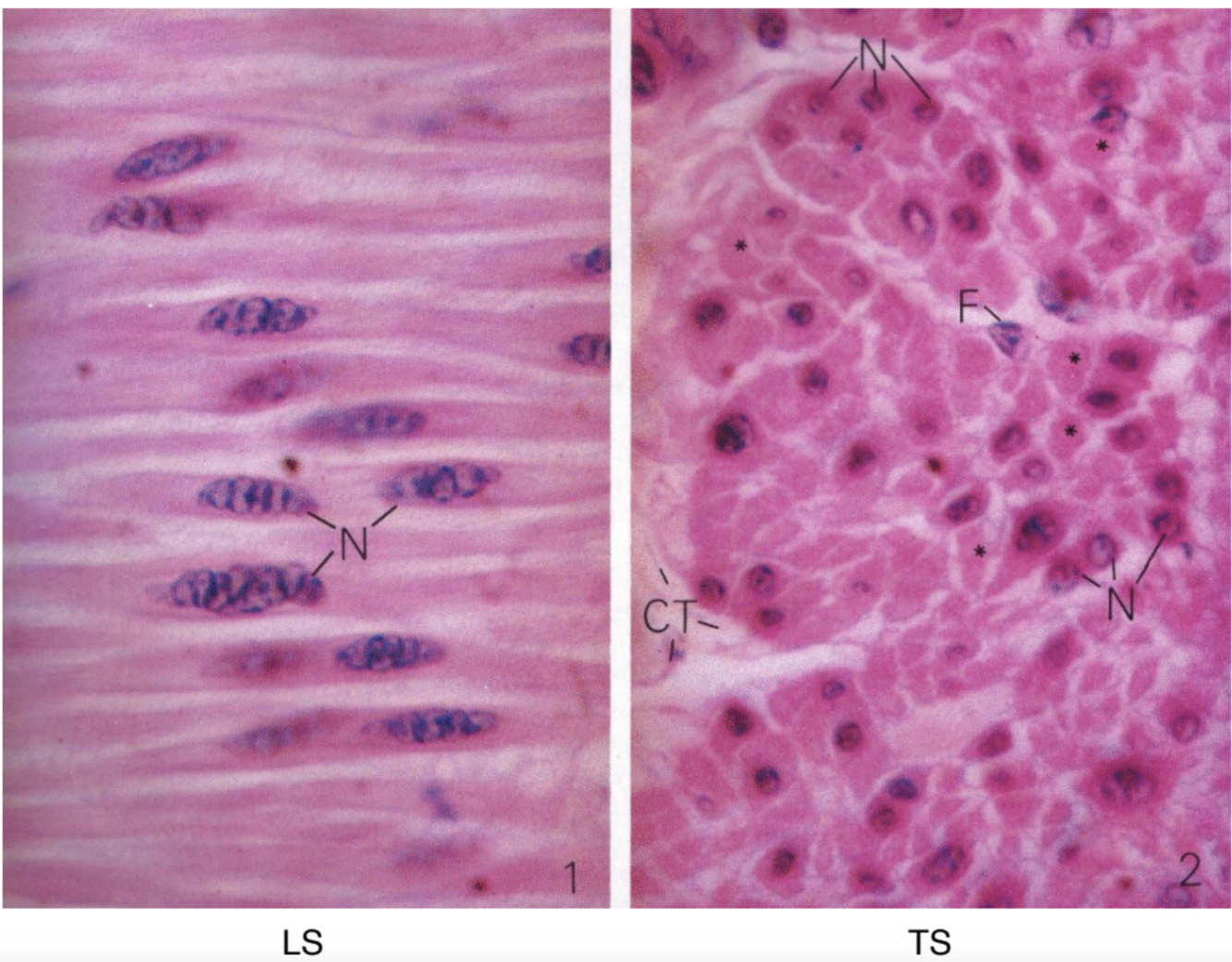 Transverse and longitudinal sections show low spindly cells w 1 nucleus in each of them. No stripes