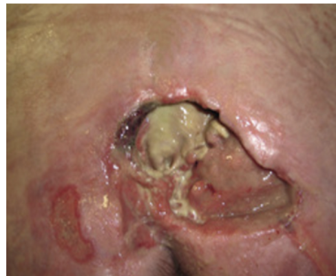 A wound care nurse is managing a client with Stage IV pressure ulcer. The wound was noted to be foul-smelling with yellowish discharge draining copiously. Which of the following findings is most concerning for the nurse?