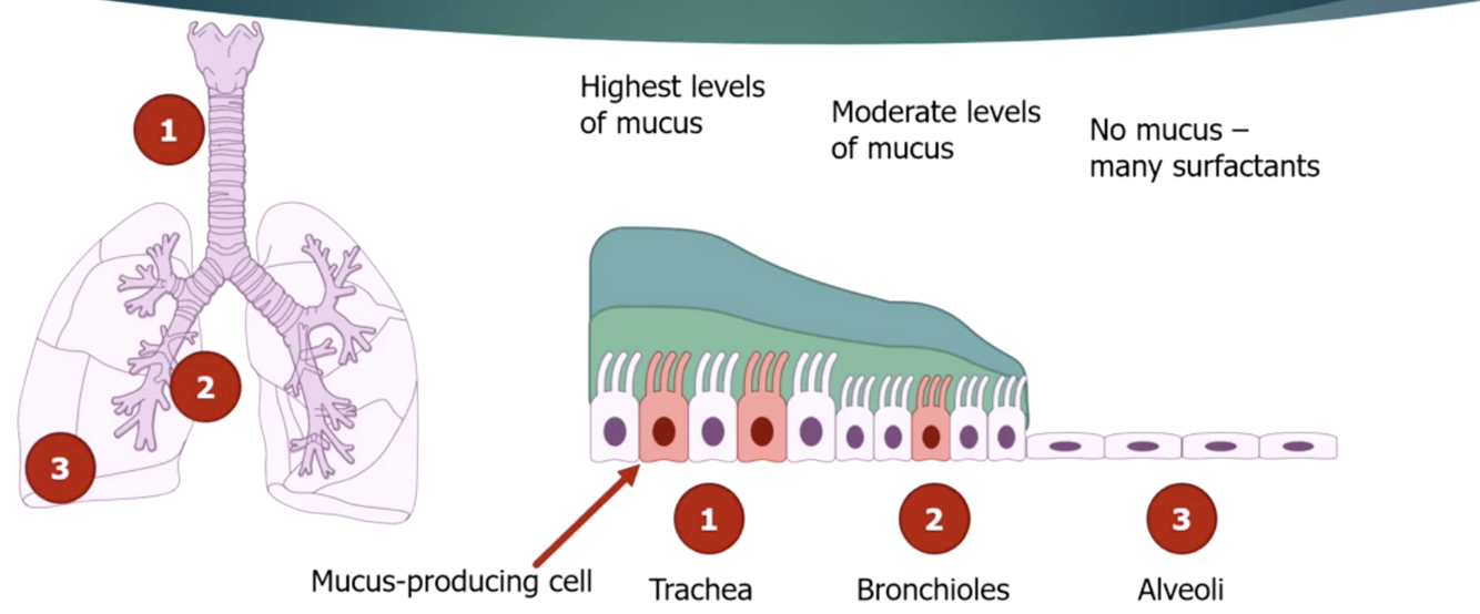 What region of the lung has the most mucus? The least?
