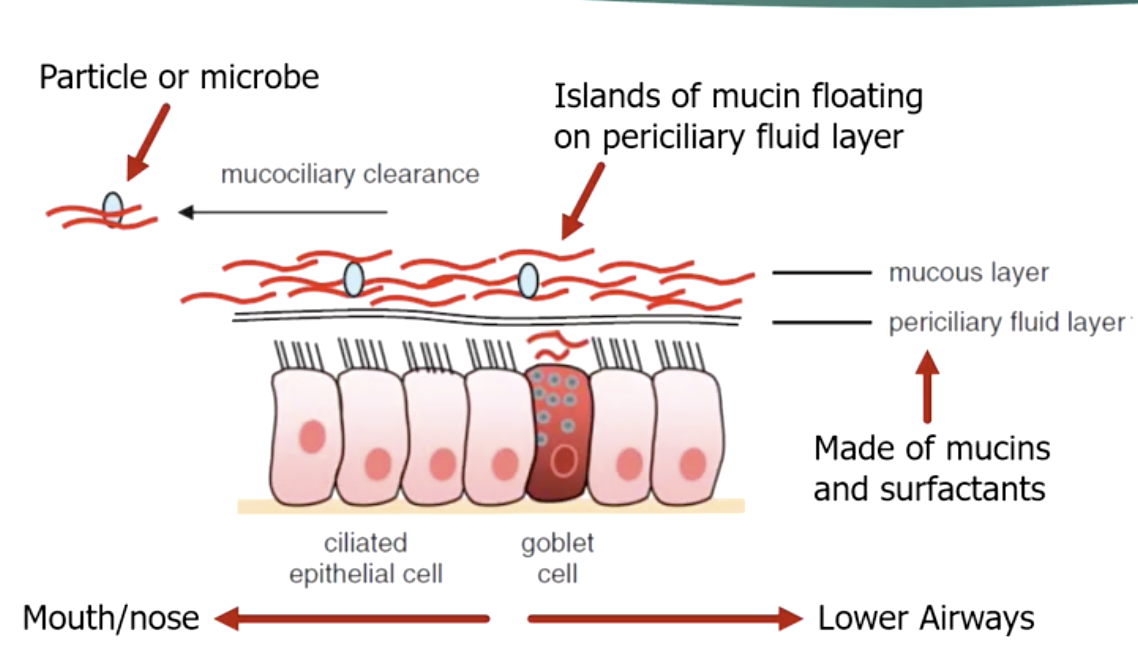 goblet cells make mucus that traps microbes –> cilia moves up to GI tract