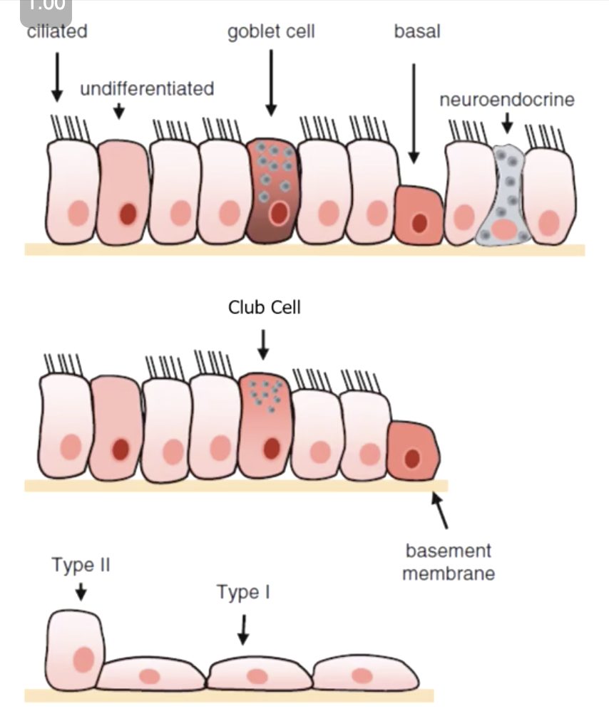 List the 6 types of lung epithelial cells