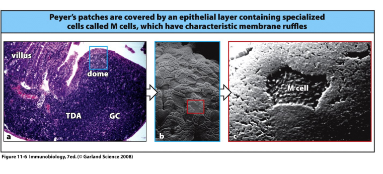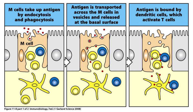 Adaptive (acquired) Immune response include functions of antigen uptake and antigen presentation. The GI immune system has develop several unique mechanisms to achieve this. Peyer’s Patches (containing B-cells, T-cells, and APCs) are follicle associated epithelium which contain microfold (M cells). These structures allow special uptake and sampling of antigen. M cells contain no microvilli; a limited mucin layer, broader microfolds, and do not secrete lysozymes so are constantly exposed to antigen. M cells transport antigen from gut lumen to immune cells across epithelial barrier by endocytosis and deliver it APCs essentially bypassing normal IECs transport.