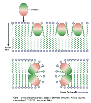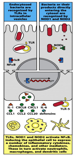 Innate mechanisms of the mucosal immune system include the mucosal barrier, PAMPs, antimicrobial peptides, immune cells, and the intestinal flora as compared to adaptive immune cells such as T cells and IgA (review). Innate immune system is the first line of defense from a stimulus, has multiple cell types, an absence of specificity, and lack memory. Intestinal Epithelial Cells (IECs) form the physical barrier in GALT as described above, but IECs are also active immune cells that constitutively participate in antigen trafficking and recognize and react to components of bacteria or viruses (pathogen associated molecular patterns, PAMPs) via pattern recognition receptors (PRRs). PRRs include either Toll-Like Receptors (TLRs) on both the apical and basal surface of the cell or NOD1/2 which are intracellular. TLRs recognize various microorganism components of bacteria such as lipopolysaccaride (LPS) which is recognized by TLR-4. In addition, specialized IECs, Paneth cells of the small intestine can secrete antimicrobial peptides which can rupture the bacterial cell and limit bacterial translocation. Reacting to pathogens epithelial cells can produce pro-inflammatory cytokines (IL-1, TNF-D) or anti-inflammatory cytokines such as (IL-10, PPAR-J) depending on the stimulus. Commensal bacteria are essential to interact with IEC via TLR and maintain normal small bowel and colonic health.