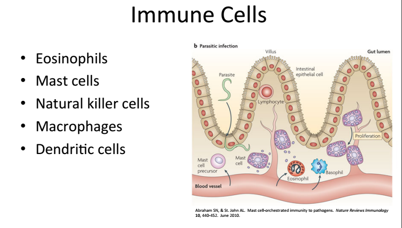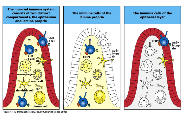 The Lamina Propria (LP) located just beneath the epithelium contains billions of activated plasma cells, IgA, as well as CD4/CD8 T cells, macrophages, NK cells, dendtritic cells, eosinophils, and mast cells.