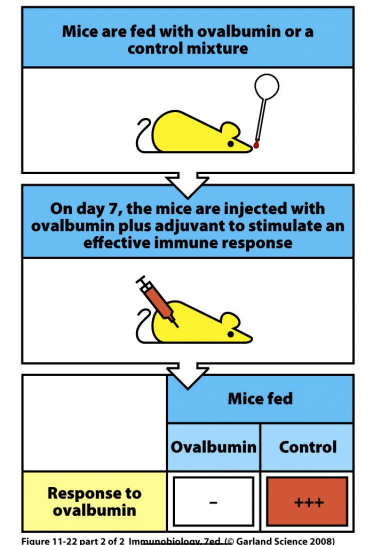 Despite the gut being the largest lymphoid organ of the body, active inflammation is not normally present. The lymphoctyes of the lamina propria have a massive influx and activation known to be caused by colonization of bacteria, but do not have normal expansion or inflammation. This well documented phenomena is related to several key concepts such as oral tolerance and bystander suppression. Oral tolerance can be defined as the active, antigen specific non-response to antigens administered orally. An example of oral tolerance is the development a decreased systemic response to ovalbumin in mice following oral ingestion. (Maureen G et al., J of Immunology, 1986). Oral tolerance is dependent on the dose of exposure and form of exposure. Proteins are the most immunogenic with carbohydrates and fat less so. Large antigen doses induce more tolerance than small. This process appears to be mediated through expansion of T regulatory cells (CD4+, CD25+, FoxP3) that promote the production of transforming factor-β (TGF-β). In addition, co-administration of an antigen after oral tolerance causes bystander suppression, showing the effector arm of oral tolerance can be antigen non-specific.