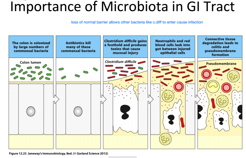 The barrier of epithelial cells is a biologically active structure that interacts with the environment. The first layer of the intestinal barrier is a mixture of glycoproteins (mucins) that decrease the ability of microorganisms to penetrate the intestine and trap antigens. Beneath the mucins are the epithelial cells joined by tight junction proteins complexes which is the physical component of the barrier. Substances can pass through the actual epithelial cell (transcellular) or through the intercellular spaces (paracelluar). The commensal microbiota are also an important component of the normal intestinal barrier and loss of intestional bacteria can lead to infection (C.Diff). The colon has the largest amount of commensal bacteria.