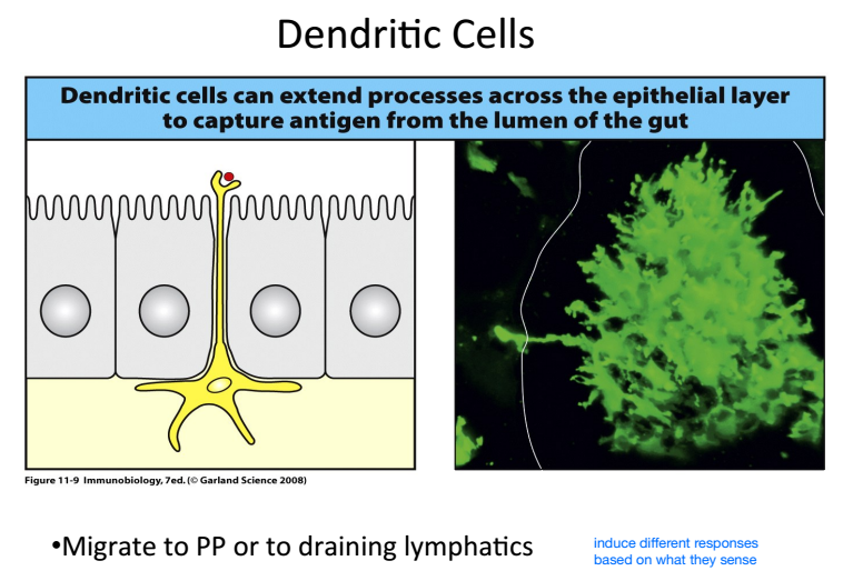 Dendritic Cells are APCs that can acquire antigens across an intact epithelial barrier without the need for M cells or transport of antigen across the epithelial barrier. They are abundant mainly in the lamina propria, and may travel to mesenteric lymph nodes once exposed to antigen to interact with naïve T cells, but generally produce an anti-inflammatory response such as IL-10. DCs frequently interact with commensal bacteria and both are essential to maintain the normal in the controlled/physiologic inflammation that is characteristic of the mucosal immune system.