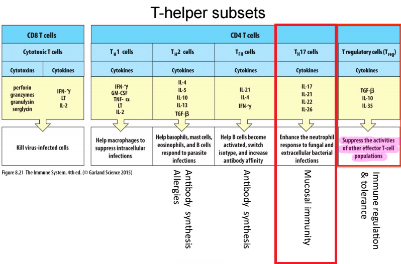 TH17 cells secrete IL-17, IL-21, IL-22, and IL-26 to enhance the neutrophil response to fungal and extracellular bacterial infections.