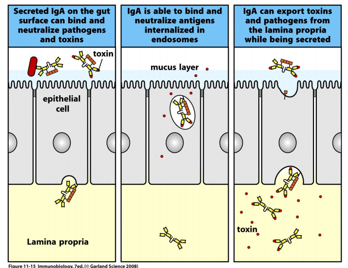 IgA is the hallmark of GALT immune responses, the major effector of the adaptive humoral immune response in the GI tract, and due to the large surface area of the GI tract is the most abundant antibody in the body. The lamina propria is the major site of sIgA synthesis, and is secreted in a soluble form (SIgA). Secretory IgA (SIgA) is a dimeric form of two IgA monomers bound together by a J chain. Subsequently, the dimer binds to a secretory component known as polymetric Ig receptor, a highly specialized 55-kd glycoprotein produced by IECs. SIgA is then transported into the intestinal lumen by a within a vesicle to the apical surface. SIgA has a mainly an anti-inflammatory effect and does not activate classic complement components. SIgA will bind to luminal antigens and promotes agglutination and removal of the antigen in the mucous layer overlying the epithelium.