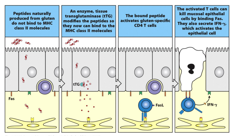 Celiac pts test positive for tissue transglutaminase (TTG) which deamidates a gluten protein (α-gliadin) which convers glutamine to glutamic acid.