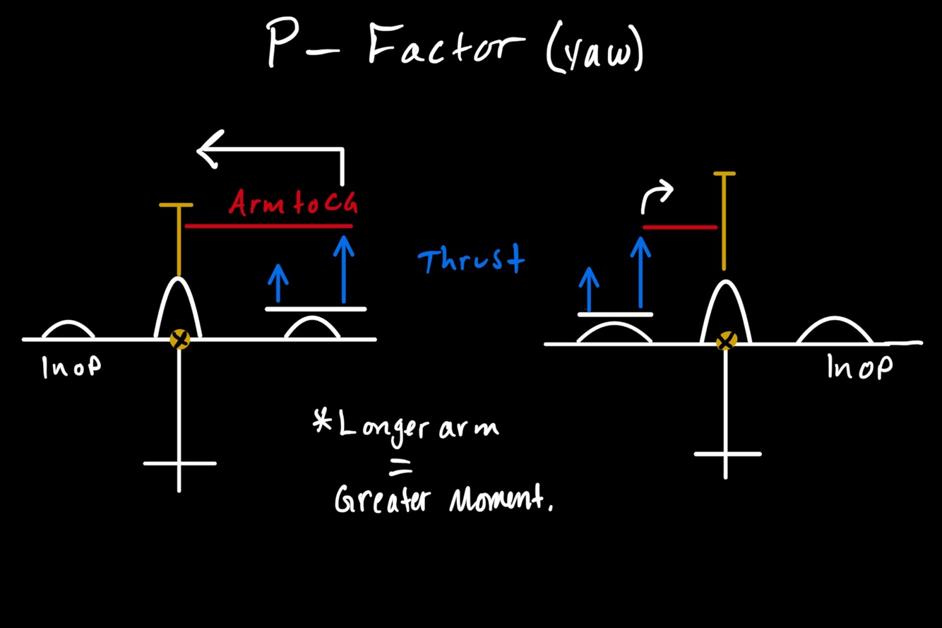 * The P-Factor created by the RH Operative engine, has a longer Arm (distance) from the CG than the left engine.