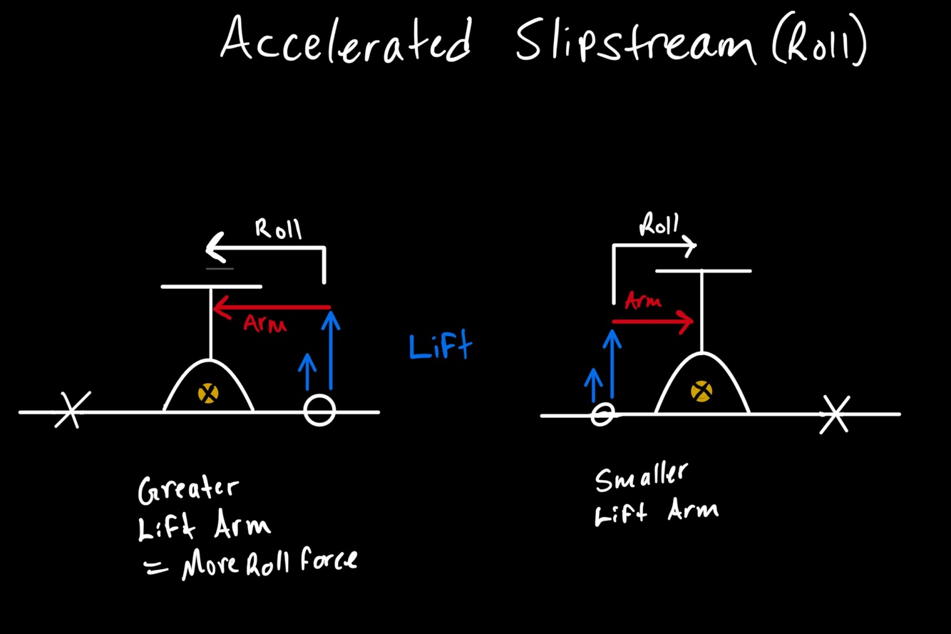* More lift is able to be produced behind the RH engine giving us asymmetrical lift on the right wing, inducing a roll to the left