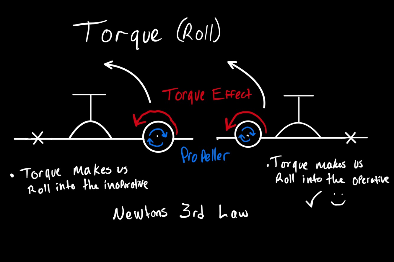 * Greater thrust on the descending blade of the operative RH engine creates more prop wash