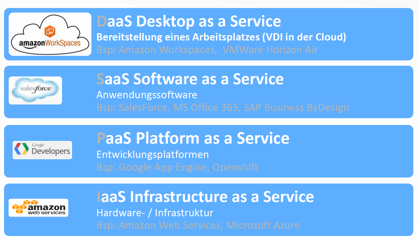 Nenne und erläutere die 4 unterschiedlichen Möglichkeiten/Arten für Cloud Services