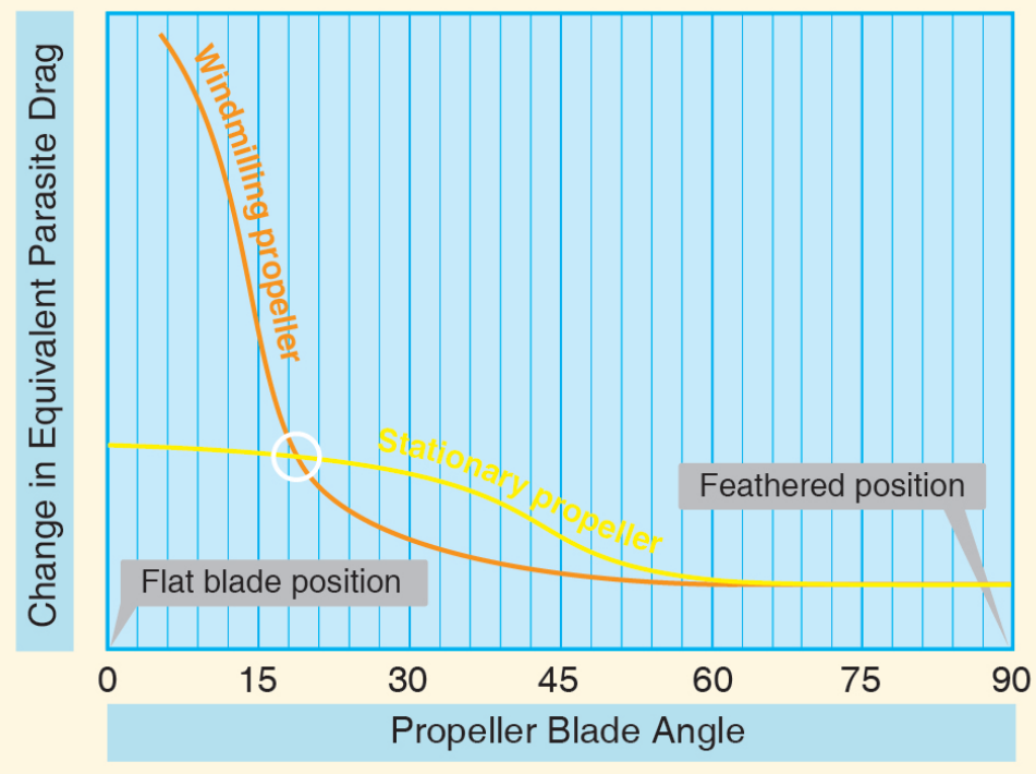 When the propeller blade angle is in the feathered position, parasite drag from the propeller is at a minimum. In a typical multiengine airplane, the parasite drag from a single, feathered propeller is a small part the airplane’s total drag.