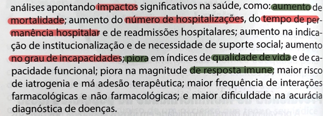 Aumento nas taxas de mortalidade, hospitalizações, permanência hospitalar e reinternações; aumento da incapacitação e necessidades de suporte social; declínio da qualidade de vida e da capacidade funcional.