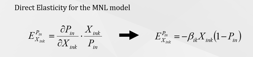 •Direct elasticity measures the change in probability of choosing a particular alternative in the choice set with respect to a given percentage change in an attribute of that same alternative.