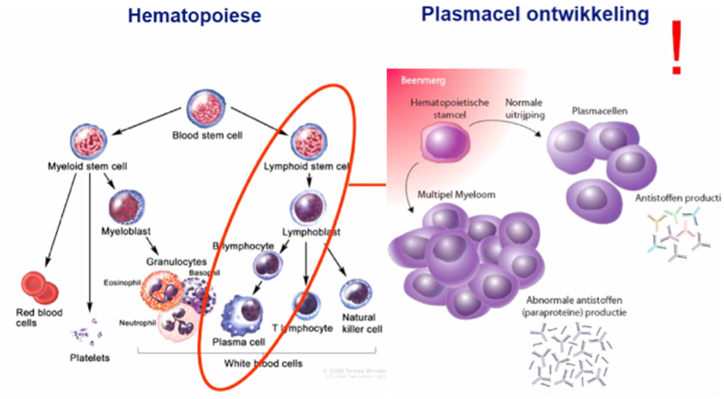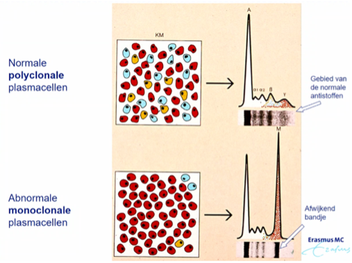 MM: 1 type plasmacel die zo gemuteerd is–> kan niet dood gaan–> heel veel monoklonaal eiwit van 1 type plasmacel (=paraproteïne)–> heel weinig plek voor andere Ig’s voor afweer