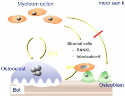 Plasmacel kan RANK-ligand maken–> activatie osteoclasten en remt blasten, bij MM is die balans verstoord–> meer clasten en minder blasten activiteit–. veel botafwijkingen