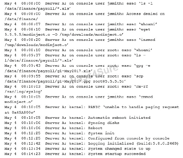 A security administrator was informed that a server unexpectedly rebooted. The administrator received an export of syslog entries for analysis: