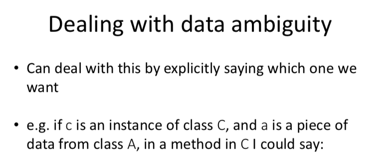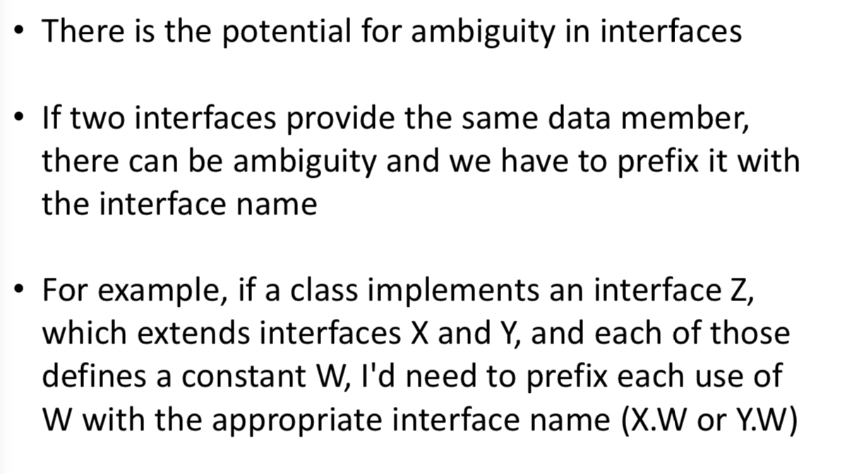 If a class implements an interface Z, which extends interfaces X and Y, and each of those defines a constant W… seeing as they are providing the same data member, how do we tell the difference between them?