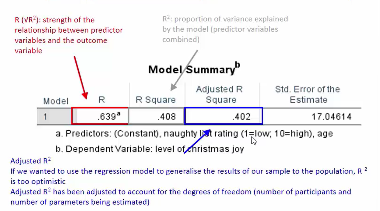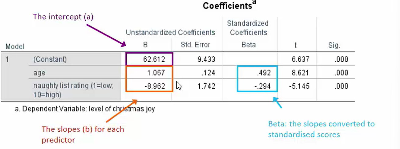 what standardized coefficients mean: e.g. as age increases by 1 SD, Christmas joy increases by 0.49 SD