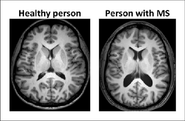 What might be seen on an MRI that happens due to demyelination of the nerves in MS ?