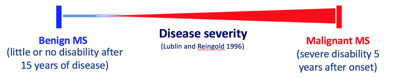 We are unsure what affects the prognosis. The patient may have end up experiencing a relatively benign form of MS with little or no disability after 15 years, or a more malignant MS with severe disability 5 years after onset. The majority of patients fall within the middle ranges.
