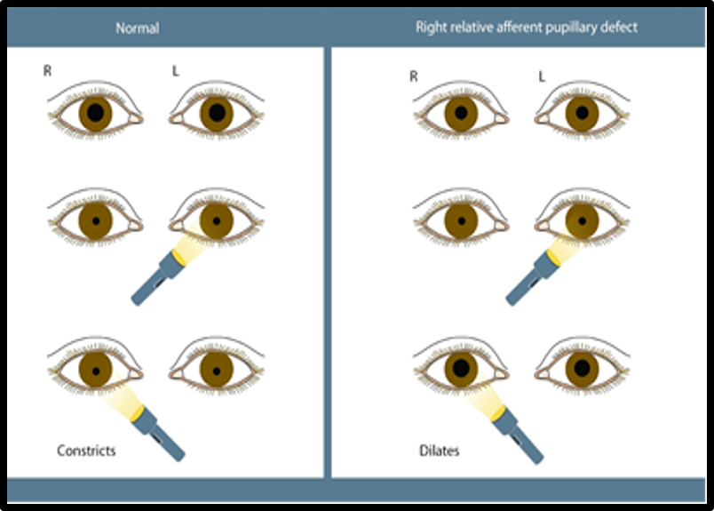 Afferent pupillary defect (Marcus-Gunn pupil) with swinging flashlight test (defect is in retina, optic nerve, chiasm, or anterior optic tract)