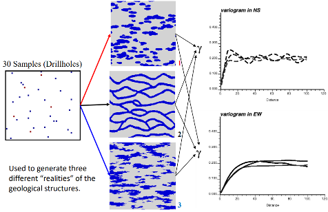 * Variogram models do not capture connectivity and curvilinear structures.