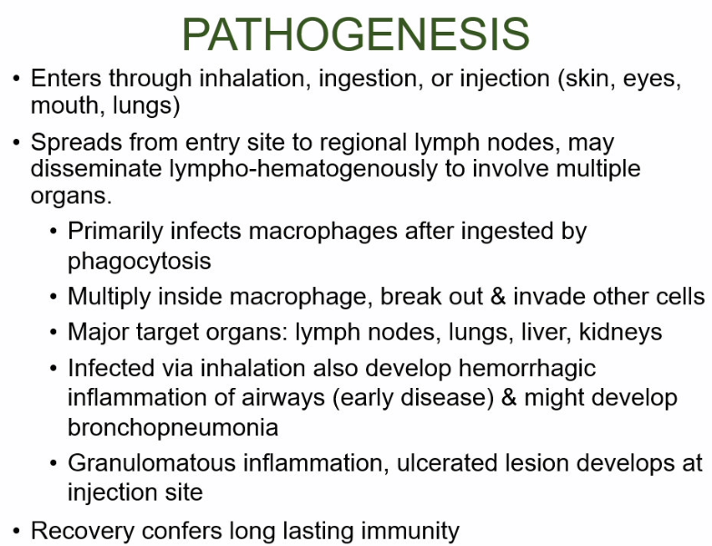 Tularensis acquired via inhalation causes hemorrhagic inflammation of the airways (early disease) and some might develop bronchopneumonia