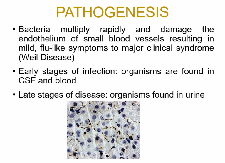 L. interrogans multiply and damage the endothelium of small blood vessels resulting in mild, flu-like symptoms to major clinical syndromes, such as Weil Disease