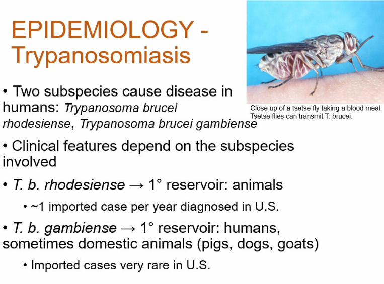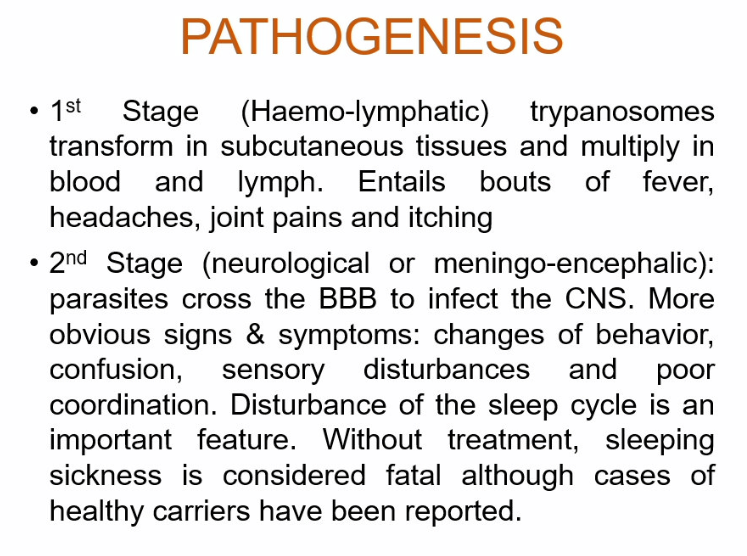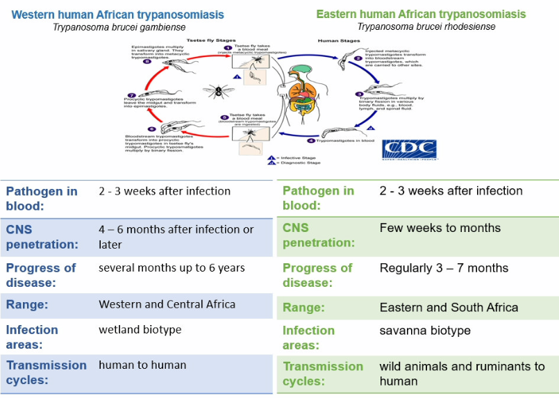 T. b. rhodesiense progresses quickly (1st signs appear few weeks-months after infxn)