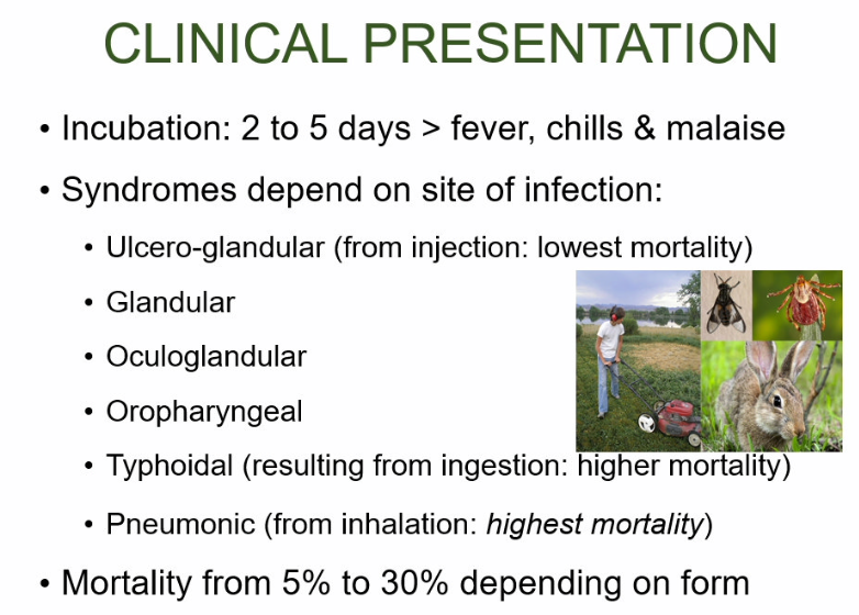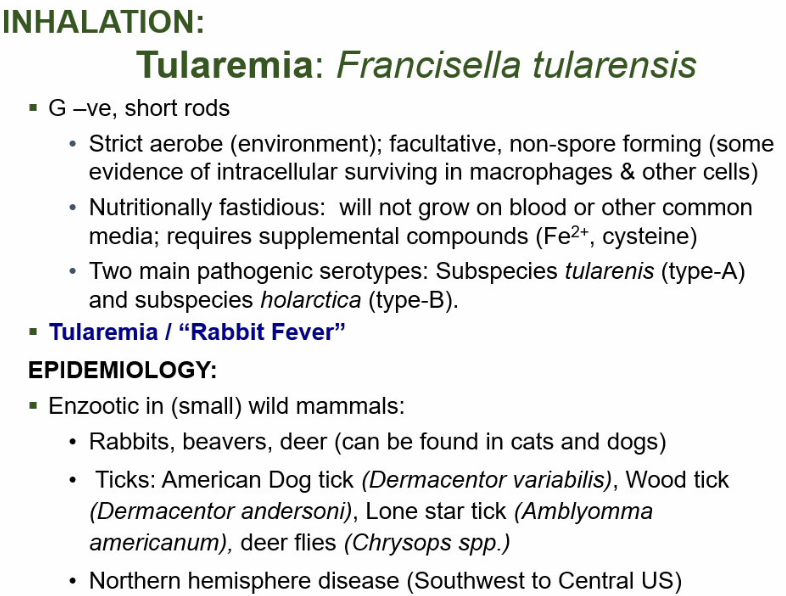 Tularensis acquired via inhalation causes hemorrhagic inflammation of the airways (early disease) and some might develop bronchopneumonia