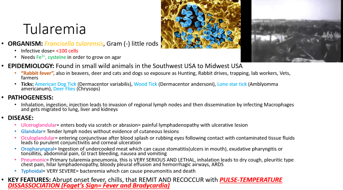 a key feature of Tularemia is pulse-temperature dissociation which is also called Faget’s sign (fever + bradycardia)