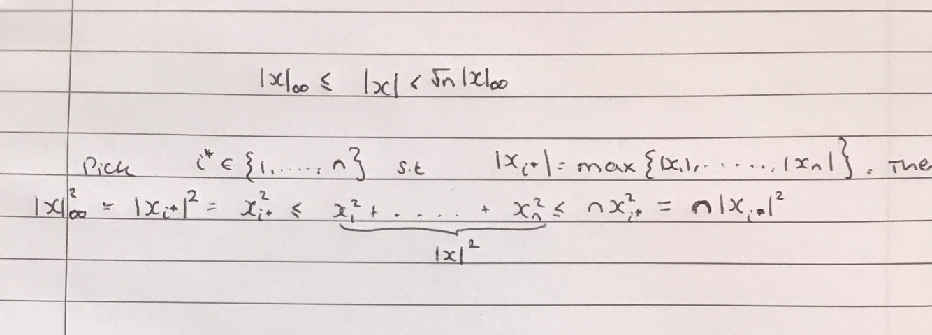 State and prove the relationship between the euclidean norm and the infinity norm