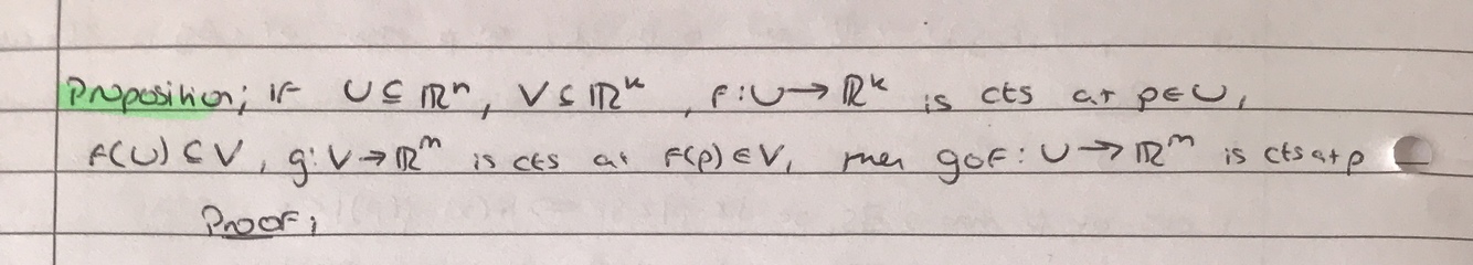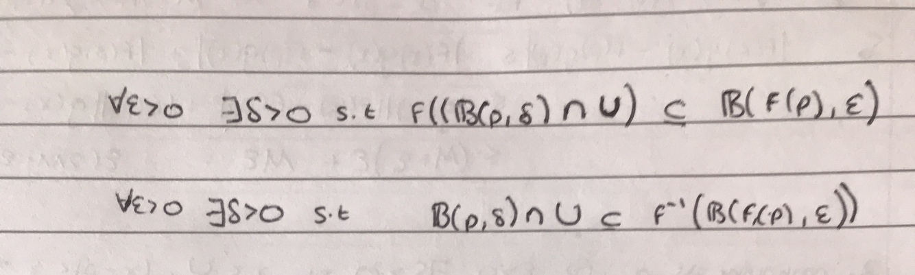 Define continuity of a function f: U to Rn at p in terms of open balls
