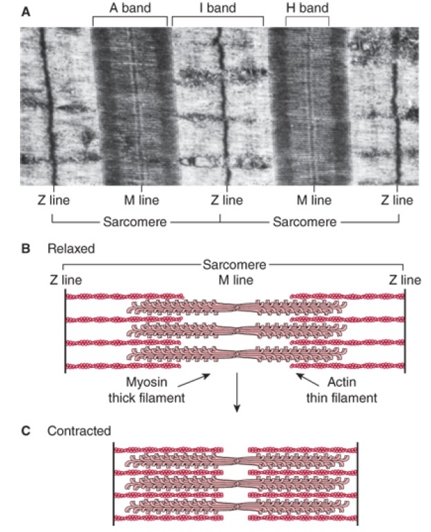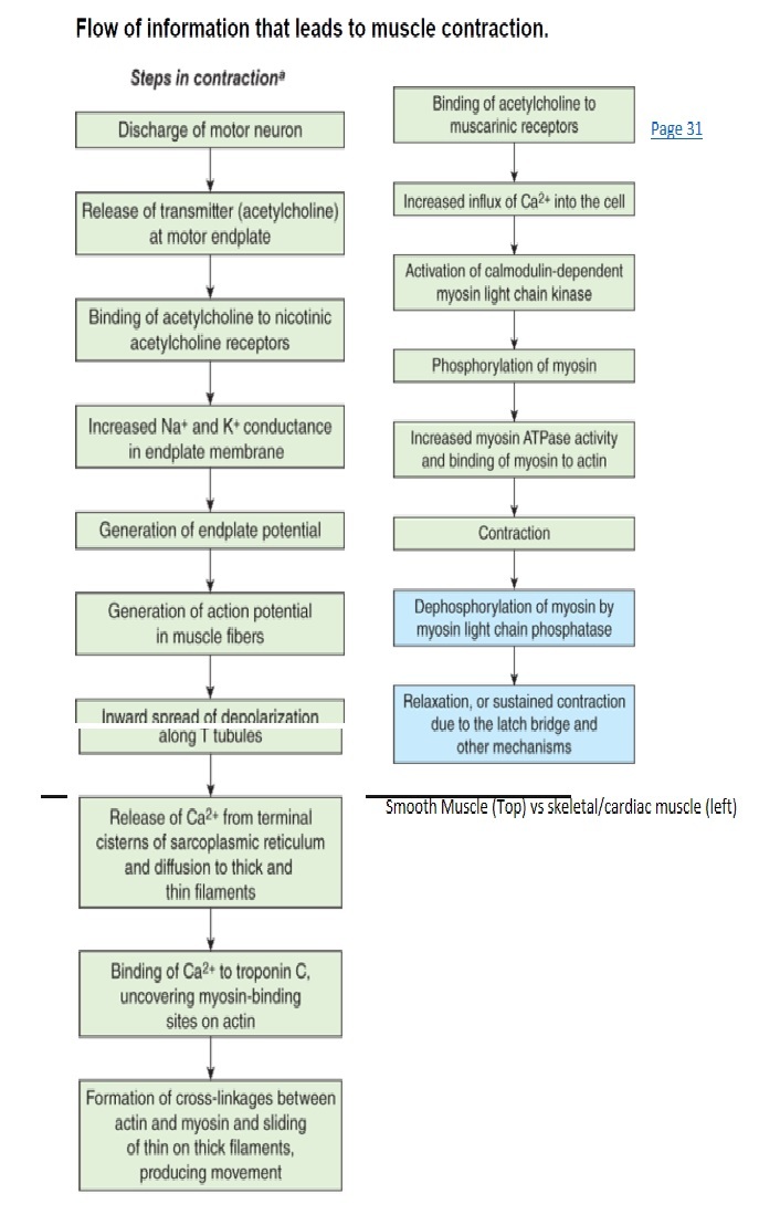 Describe the steps leading to muscle contraction in smooth, skeletal, and cardiac muscle.