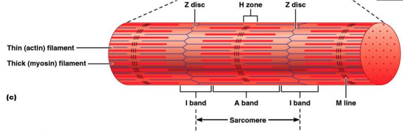 Thick and thin filaments are arranged into sarcomeres - repeated in parallel sequences that are side-by-side across a myocyte.