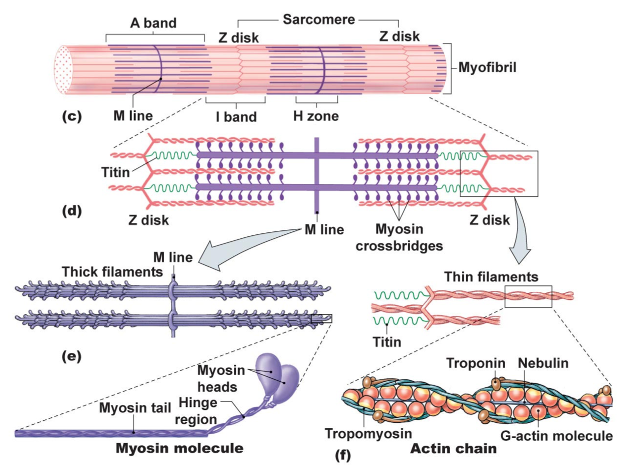the smallest functional unit of the contractile apparatus in skeletal muscle composed of many strands of two kinds of protein filaments: 1. thick filaments - made of myosin; 2. thin filaments - made of actin