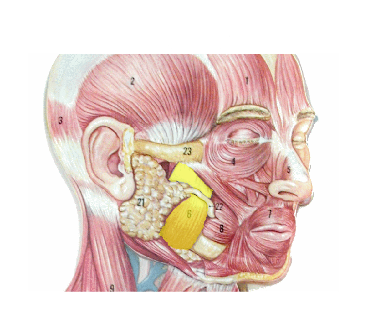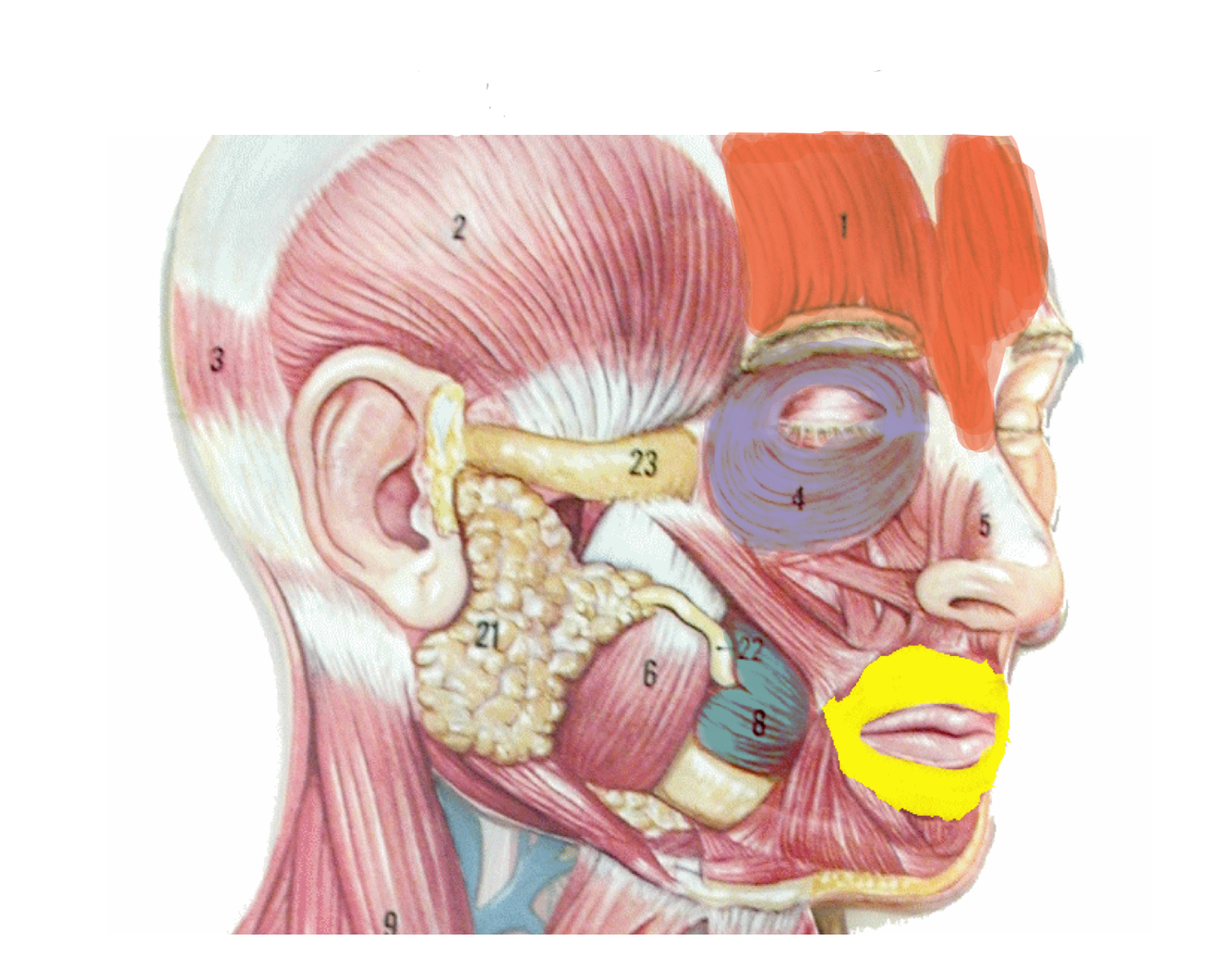 Yellow - Orbicularis oris - closes and protrudes lips (kissing)