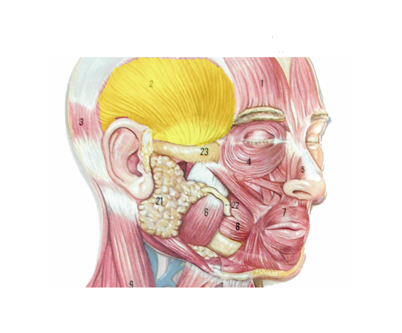 Red - occipitofrontalis - raises eyebrows