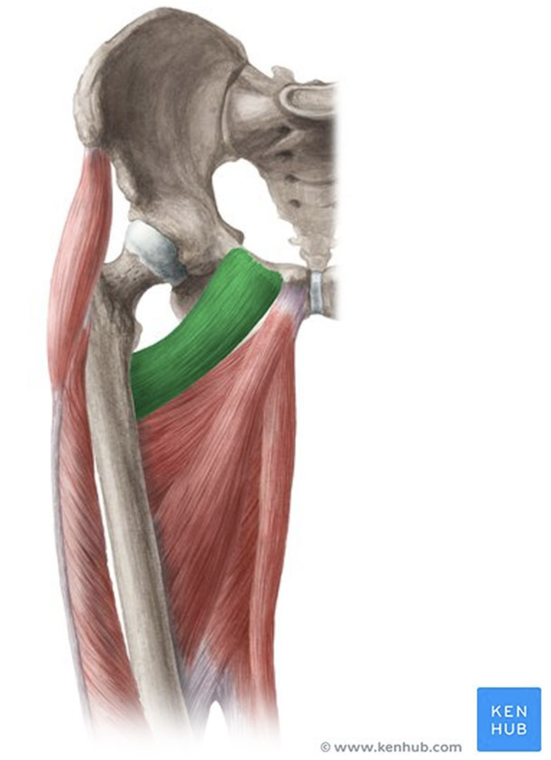 The pectineus muscle originates on the front of your pelvis (anteriorly) and inserts on the back of the femur (posteriorly), this front-to-back-cross over makes it a powerful primary mover! This small muscle is often classed as an adductor (muscles that move your thigh inwards), but it’s also a helpful hip flexor.