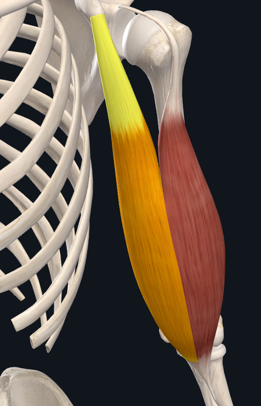 It is a two-headed muscle, but the majority of the muscle is located anteriorly to the humerus - it has no attachment to the bone itself.