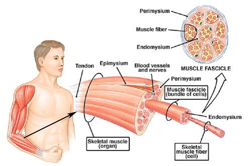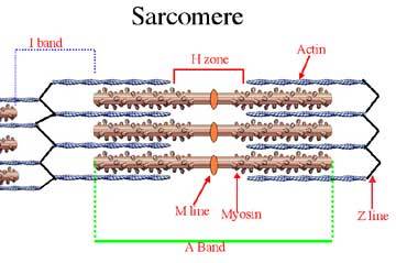 Skeletal muscle cells are multinucleate, resulting from the fusion of many myoblasts. They have a diameter of 10-100um and their length can be many centimetres. The myofibre consists of many myofibrils which are long ‘columns’ of sarcomeres. Sarcomeres are the contractile unit of muscle cells which consists of many myofilaments (contractile proteins) which are composed of thick filaments (myosin) and thin filaments (actin).
