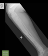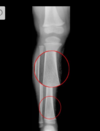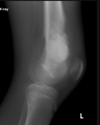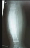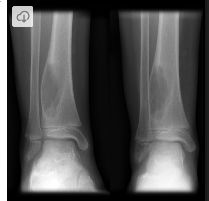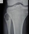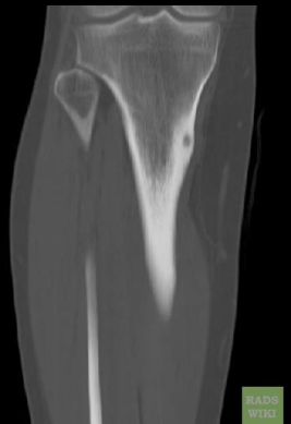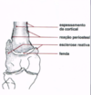Nicho radiotransparente < 1cm circundado por reação esclerótica. Localização cortical / justacortical em ossos longos: femur proximal e tibia.
